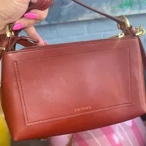 Gorgeous Zac Posen genuine leather crossbody bag in a rich brown tone with gold hardware. Features a sleek structured design, top zip closure, and stylish chain + leather strap for an elevated look. Perfect size for everyday essentials or a night out.