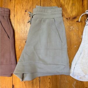 3 pairs of Varley shorts, light grey, mauve, and tan.