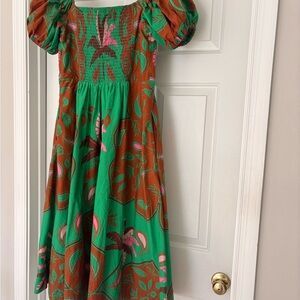 Vibrant green and brown Al-line dress with pockets and floral patterns. Features pink accents and puff sleeves. Elastic smocked back give stretch. Full skirt. Sz 12.