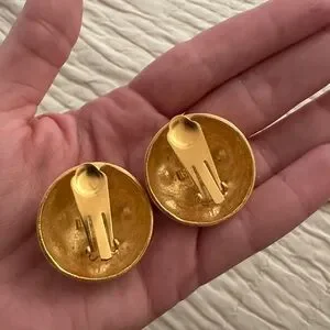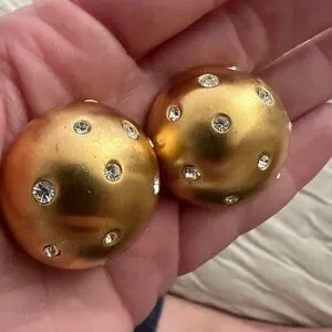 Elegant gold stud earrings adorned with sparkling rhinestones. Perfect for adding a touch of glamour. Runway. Designer
