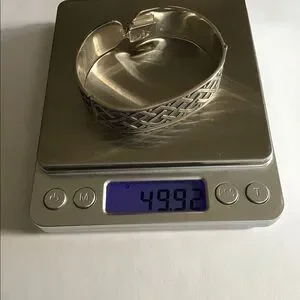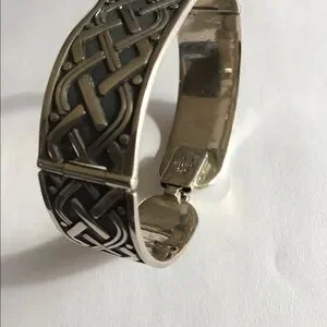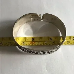 Fabulous vintage beautifully crafted oxidized sterling silver Celtic knot work style hinged bracelet. This is signed CII Mexico, and fits my 7" wrist perfect and comfortable ,with not too much wiggle room. Measures across the widest interior at almost 2.5", is 11/16" wide and weighs just shy of 50 grams. Gentle light wear and patina. So nice.