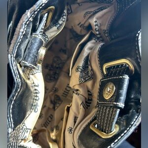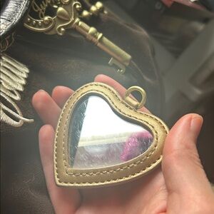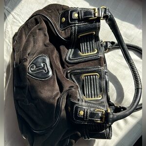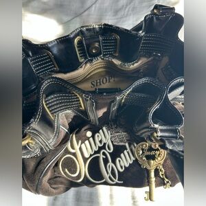 Juicy Couture shoulder bag with black faux-leather trim and stitched detailing. Embroidered Juicy Couture logo on front. Gold-tone hardware and decorative charm. Casual yet chic purse with snap closure. has not been used, no stains, wear, etc also has heart shaped gold colored mini mirror with J embroidery