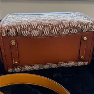 Compact satchel featuring Coach signature canvas. Smooth brown and tan leather accents. Removable leather crossbody and double straps as well as top handles. Brass-tone hardware details. Timeless, versatile design.