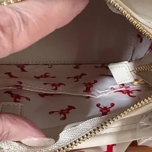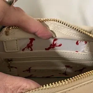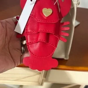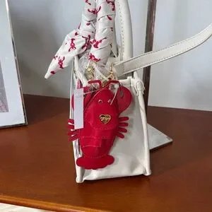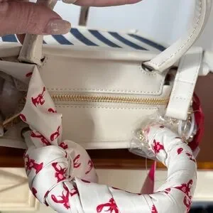 Stylish mini bag with navy and white stripes. Features a playful red lobster print scarf. Gold-tone accents add elegance.