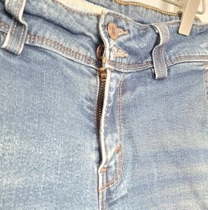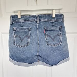 Cuffed denim shorts with a medium to dark wash and a classic button-and-fly closure.