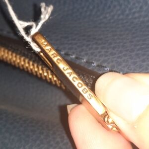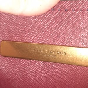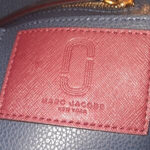 Features double top handles and aged gold-tone hardware, including embossed "MARC JACOBS" lettering.