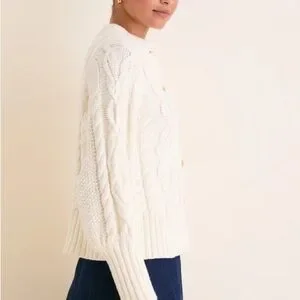 Soft cream cable-knit cardigan with gold-tone buttons. Comfortable ribbed hem and cuffs for a flattering fit. Versatile knit layering piece perfect for casual or dressy looks. Currently selling for $188 on their website. Excellent condition.