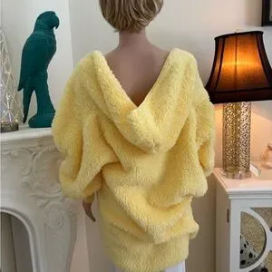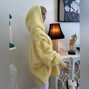 Cozy plush teddy jacket in a bright yellow. Soft, fuzzy texture for comfortable layering. Features a hood and relaxed silhouette for easy wear. Pairs well with casual and lounge outfits.