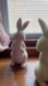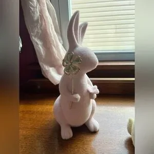 Set of three flocked bunny figurines in pastel pink, cream, and blue. Soft textured finish. Cute decorative accents for spring or nursery displays. Each one is holding a gold-toned item such as a four leaf clover, dragonfly, and carrot. These are super cute for Easter! They measure 11 1/2 and are about a medium size.