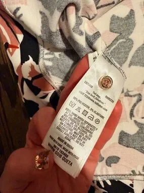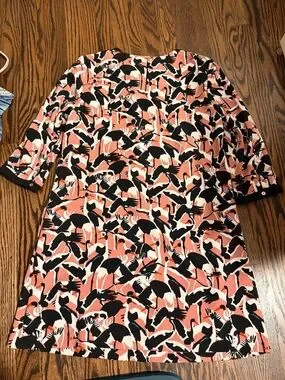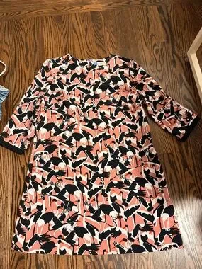 Ted Baker dress in pink and black with white accents. Bold floral pattern across a smooth fabric. Comfortable shift-style silhouette. Stylish for daytime or casual events.
