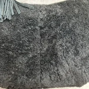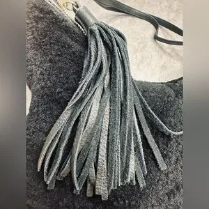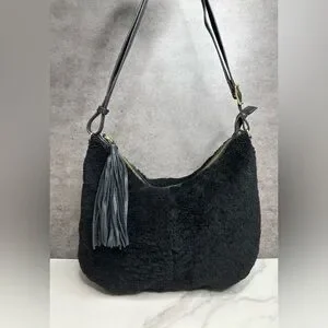 Lovely Margot shearling hobo style bag in black with leather straps and gold hardware. This slouchy, boho-inspired bag features a leather tassel detail and versatile strap design, making it suitable as a shoulder bag or crossbody.