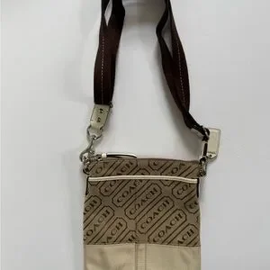 Compact Coach crossbody with signature logo jacquard. Beige lower panel and brown logo pattern. Adjustable brown strap with silver hardware. Zip-top closure for secure carry. Ideal for hands-free everyday use.