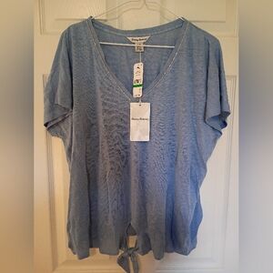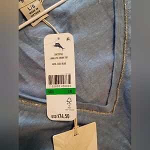 MSRP $75. Elevate your casual wardrobe with this Tommy Bahama V-neck top. Crafted in a soothing blue, it's perfect for any occasion. Enjoy comfort and style with this essential piece. Really quality top. all linen tie bottom. Beautiful beading at neckline. Just a beautiful shade of Cabo blue. I'm selling several other brand name items. Bundle and save. Cross posted. Thanks for looking!