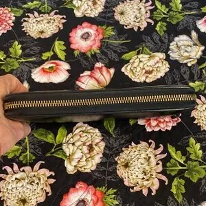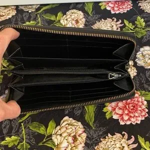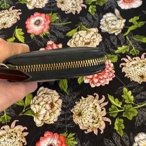 Gucci zip-around wallet in black leather-look material. Front displays a striking red, white, and black snake motif. Clean, modern aesthetic. Distinct designer branding on the front corner.