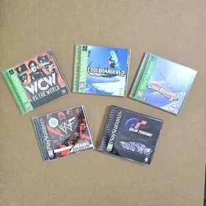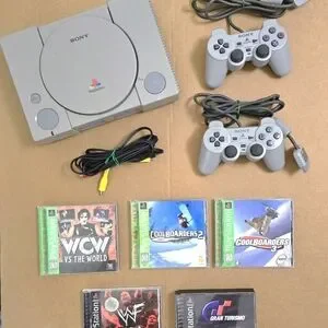 Sony Playstation SCPH - 9001 Console W/2 Hand Controls (6) Games "READ" EUC".This Sony Playstation Console is my son's from the 90's & in EUC. However, it has NOT been tested. I have 6 Playstation games and/or game manuals that are included.The WCW vs The World, Coolboarders 2 & 3 are complete with their disc & manual, WF Attitude only comes with the manual, & Grand Turismo, which is a double disc & double manual, only has 1 disc, but has both manuals. Please contact me if you have further questions.