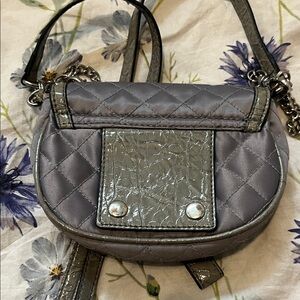 2000s Guess bag with a sequin guess logo. Quilted pattern and shoulder strap+ hand strap. Ideal for any occasion. damage is shown clearly in photos. just a little flaking on the hand strap and slightly on the shoulder strap. minor lipstick stain on the back and slightly bigger on the inside