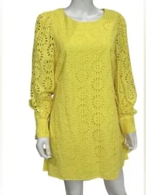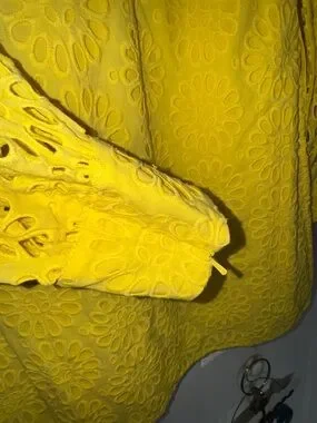 Bright yellow eyelet mini romper with long eyelet patterned sleeves. Lightweight and breathable 100% cotton fabric for comfortable wear. Feminine silhouette that flatters the figure. Easy to style for daytime or evening events. Preppy coastal , perfect for all occasions