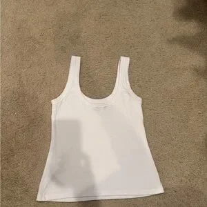 Slim white tank top with a centered red apple patch reading "NYC". Scoop neckline and wide straps. Lightweight, breathable cotton for everyday wear. Simple, versatile styling for casual outfits.