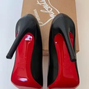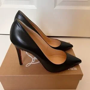 Classic Christian Louboutin stiletto pumps in smooth black leather. Pointed toe and sleek classic silhouette. Leather interior for refined comfort. Timeless design for evening or office wear. Size 40. Comes with box, dust bag and replacement heel taps.