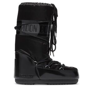 Moon Boot winter boots in glossy black. Lace-up front for a secure fit. Padded shaft for warmth. Rugged sole for traction in snow.