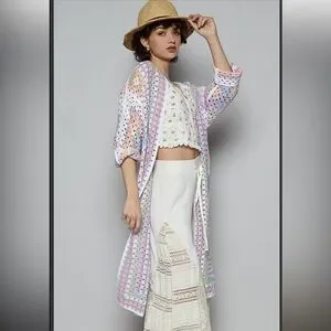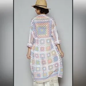 Vibrant crochet cardigan. Features multicolor square patterns. Lightweight and stylish