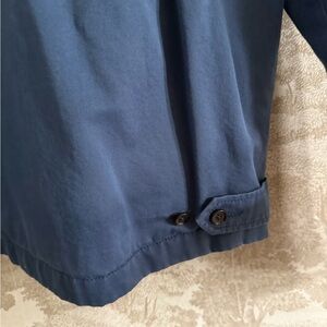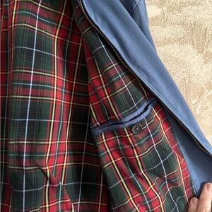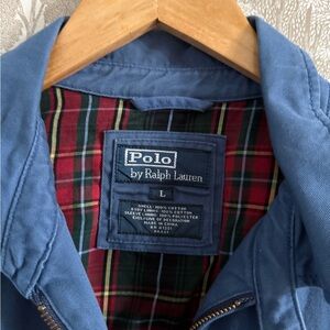 Solid blue shell with embroidered red Polo logo on chest. Tartan inner lining visible at collar. Slanted front pockets for easy wear.