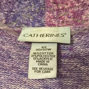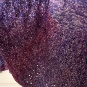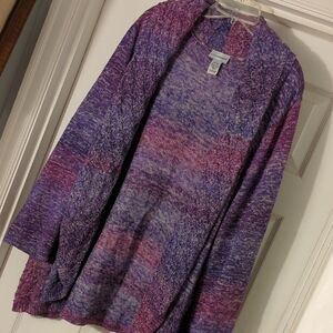 Elegant knit open front cardigan with a blend of hues with a scalloped crochet detail on the front and around the neck. the main body is a closed knit. Perfect for layering and adding warmth and color to a spring wardrobe.