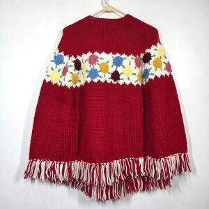 Vintage Handmade Sweater Cape One Size Red Knit Cottagecore Grandma Boho