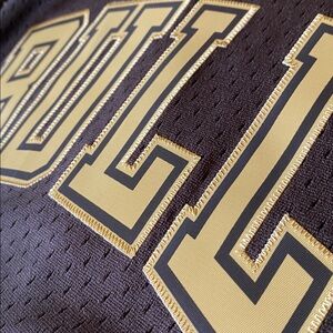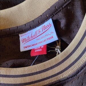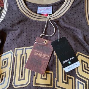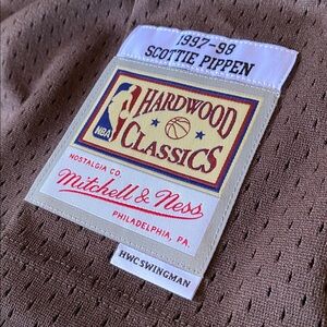 This Hard Wood Classics Mitchell & Ness Lux Brown Swingman Jersey features "BULLS 33" on front panel and player name and number on rear. "1995-96 Scottie Pippen Hardwood Classic HWC Swingman" Patch on bottom left side of jersey.