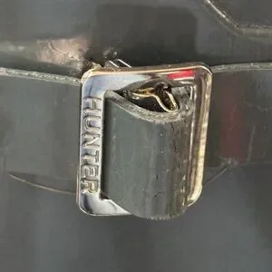 Close-up of Hunter logo panel inside boot. Printed branding and crest visible. Dark interior with contrasting light logo. Clean graphic detail for authentic pair.