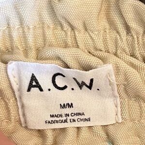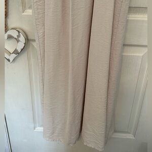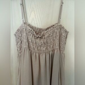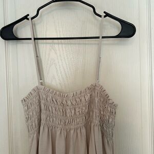 Flowy maxi dress with smocked bodice and thin straps. Soft light beige tone. Simple and elegant silhouette. Versatile for daytime or evening wear. In good pre-owned condition. Size medium - 14 inches from pit to pit. Has stretch. Side pockets. Thank you for looking!
