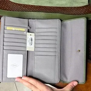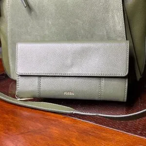 NWT Fossil shoulder hobo crafted in chive color suede with leather accents. Adjustable strap and studded side detailing. Gold-tone hardware for subtle shine. Spacious interior ideal for daily use. Comes with Wallet also is NWT see all photos nwt retail price for both is $316