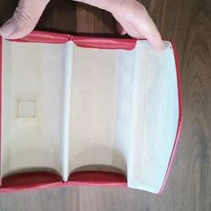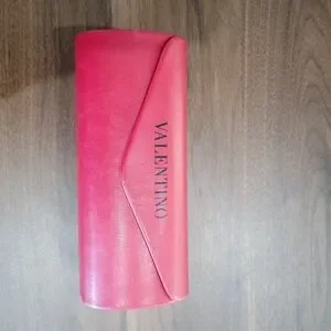 Genuine Valentino sunglasses case. Smooth red leather exterior with embossed logo. Magnetic flap closure. Structured shape protects eyewear. Sleek designer accessory.