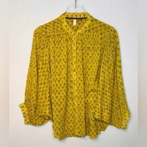 This Sidney blouse is created with a goldenrod yellow cotton, printed with dainty green and blue flowers. Designed for the romantic in mind, this blouse features a mandarin collar with a button placket down center front. Oversized bodice with batwing style sleeves with single button, banded cuffs. Shirttail, curved hem that can be worn tucked in to your favorite jeans or allowed to flow free for a true bohemian look. Unlined.