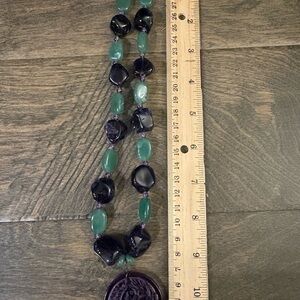 Elegant necklace featuring a purple carved pendant with green stone beads.