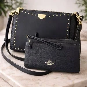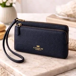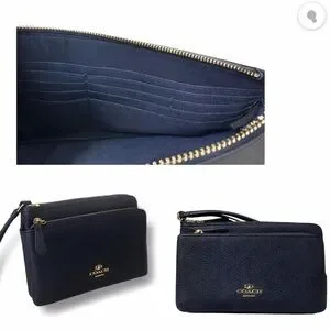 See matching Coach bag sold separately! Elevate your everyday essentials with this authentic Coach double zip wristlet wallet in a rich navy blue pebbled leather. Timeless, functional, and effortlessly chic, this piece is perfect for on-the-go organization or as a sleek grab-and-go clutch.