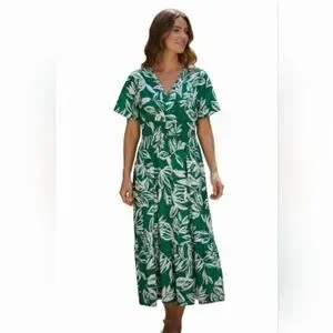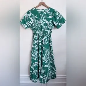 Meadow Rhodes Green White Floral Midi Dress smocked short sleeve M