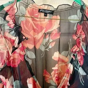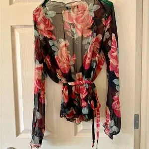 Absolutely stunning Vintage Y2K Betsey Johnson Silk Georgette Wrap top. Black with red roses and green leaves. The Silk is so pretty and has a delicate ruffle around the neckline and cuffs. I am the original owner and I’ve only worn once and have kept in my closet for since I first bought it in the late 1990’s. I don’t want to let it go but very rarely have the occasion to wear so it should go to a new home.