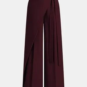 High-waist wide leg pants in deep burgundy. Wrap-style front with self-tie waist. Sleek, minimal silhouette. Versatile for work or dressy occasions.