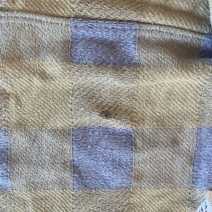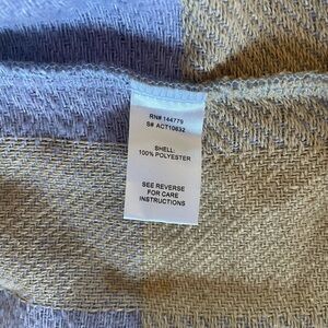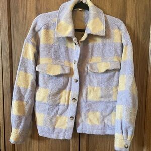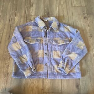 Stylish plaid button-up jacket in lavender and cream. Features a classic design with front pockets and button details. Has small black stain on inside, as pictured, but is not visible from outside of jacket. Front pockets are functional
