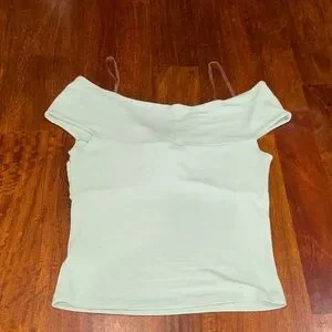 Elevate your style with this chic mint green off-shoulder top. Perfect for any occasion, this top offers a flattering fit and a trendy twist detail. A must-have addition to your wardrobe. Worn and washed a couple times. Smoke free and pet free home. Bundle and save.