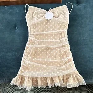 Elevate your wardrobe with this chic beige polka dot mini dress. Perfect for any occasion, its playful design and flattering fit make it a standout piece.