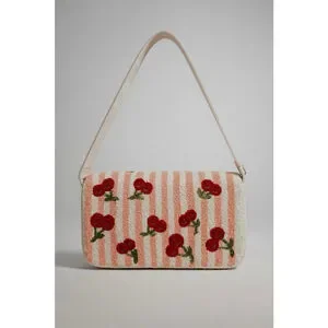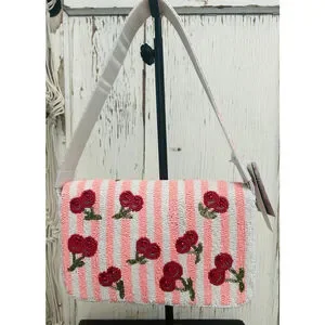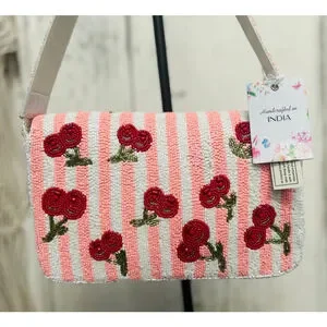Handcrafted in India Viral Beaded Cherries Cherry Pink Striped Shoulder Bag