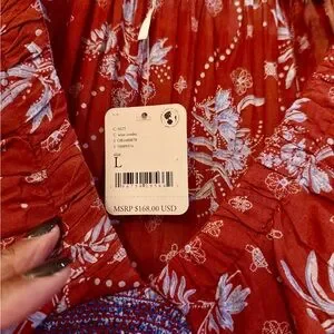 Flowy maxi dress with a red base and light blue floral print. Boho-inspired smocked waist and long puff sleeves. Lightweight and breezy silhouette. Easy to style for day or evening.