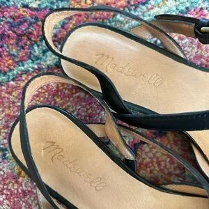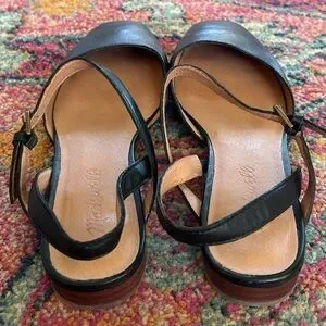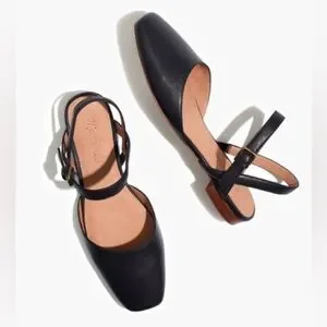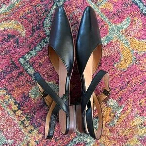 Madewell | Women’s black leather The Jeanne Slingback flats. Adjustable strap, squared toe, slight stacked wood heel, cute! Women’s size 7