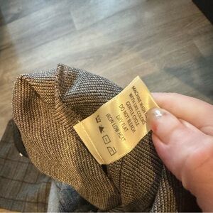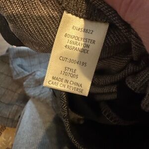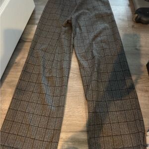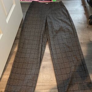 Tailored pants with subtle windowpane pattern. Elastic waist is about 13.5 inches- but can stretch. Length is about 40 inches. Black waistband and neutral patterned fabric. Sleek, versatile style for work or events.