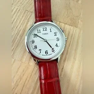 Timex ladies silver tone red leather classic watch NEW BATTERY