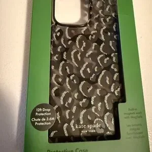 iPhone 16 Pro Max Designer kate spade protective phone case with glitter leopard pattern. Silver glitter accents over a black base. Slim profile with MagSafe-compatible magnets. Stylish everyday protection. Got as a gift & already have this one