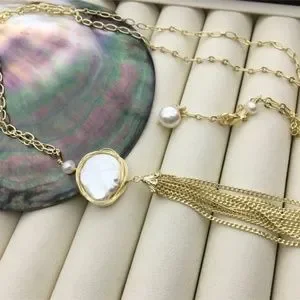 White Coin Pearl Tassels Gold Chain Necklace - Adjustable Length