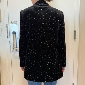 Black velvet blazer featuring scattered silver-tone studs. Open-front design with relaxed fit. Elegant texture for dressy or casual looks. Previously tailored to make it a bit shorter.